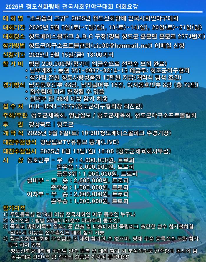 2025 청도사회인야구대회를 하기와 같이 개최하오니 많은 관심 부탁드립니다. . |